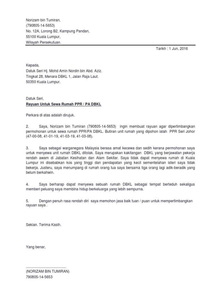 Contoh Surat Rayuan Permohonan Rumah Sewa Dbkl Wallpaper